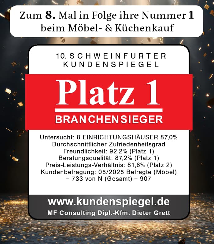 Unsere Kunden sind König! Das gilt nicht nur für den Kauf und unsere reduzierten Angebote oder die attraktiven Rabattangebote, sondern auch eine umfassende Beratung gehört zum Rundum-Erlebnis im Möbelhaus Schweinfurt. Wer also mehr Produktinformationen wünscht, kann sich die Beratertage zu den unterschiedlichen Produktarten schon mal vormerken! Grundsätzlich laden wir Sie aber natürlich immer dazu eine, unsere Möbelvielfalt kennenzulernen, auf der ein oder anderen Matratze Probe liegen oder unsere Polstergarnituren auszuprobieren. Stöbern Sie einfach durch unsere große Ausstellung im Möbelhaus in Schweinfurt und entdecken Sie die Vielfalt an Möbeln, Küchen und Heimtextilien sowie Leuchten – übrigens: Besuchen Sie vor einem Besuch auch unseren Onlineshop und verschaffen Sie sich hier einen Überblick über unsere Auswahl.