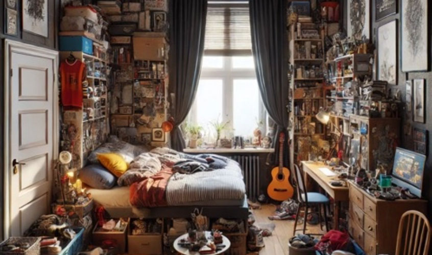 - Nutze die ganze Höhe des Raums: hohe Schränke, Regale über dem Bett oder der Tür. Wandflächen vom Fußboden bis zur Decke für Stauraum einplanen.
